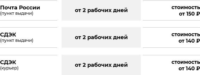 Мы работаем с разными курьерскими службами, процесс доставки надежный, быстрый и доступный в любом городе.